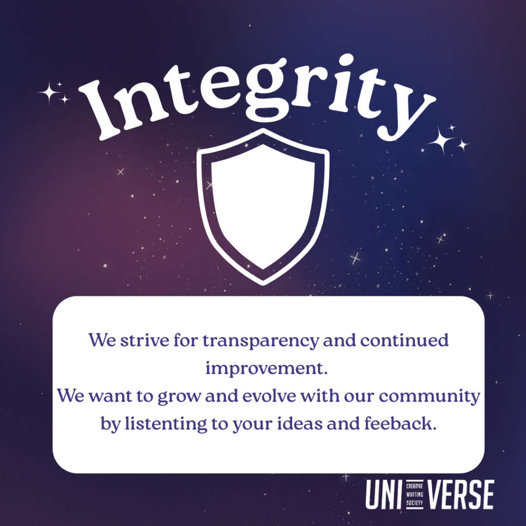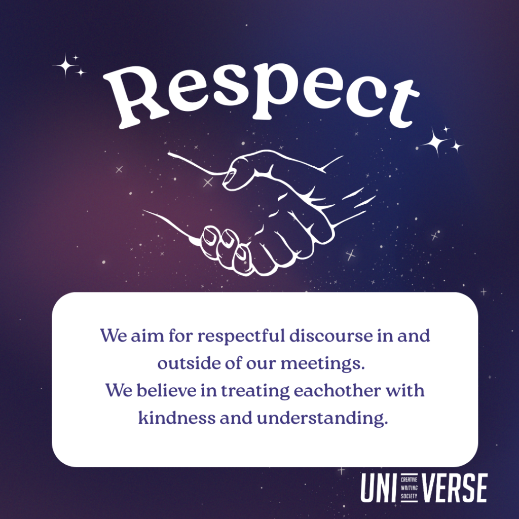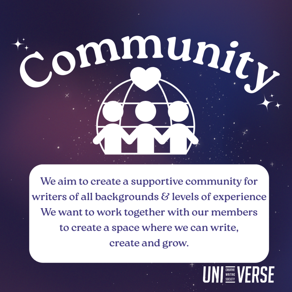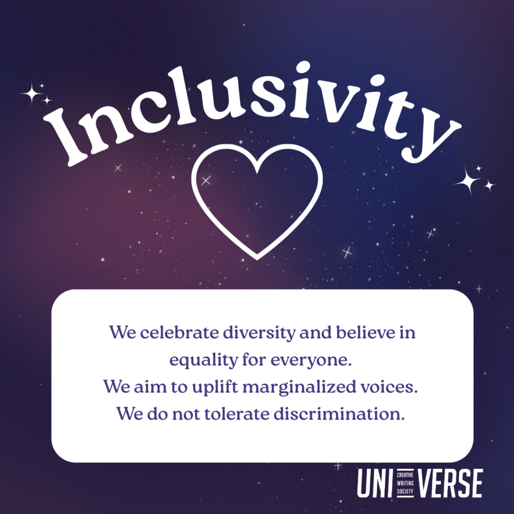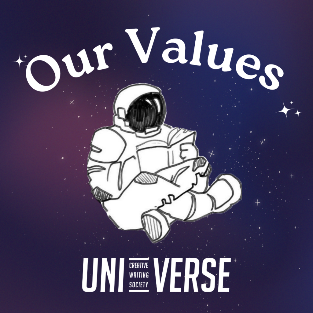 The Uni-Verse Creative Writing Society is dedicated to fostering a joyous space where creativity feels free and writers can safely express themselves with authenticity and vulnerability. We value new ideas and voices, welcoming every member with encouragement and respect, no matter their writing style, background, or level of experience.